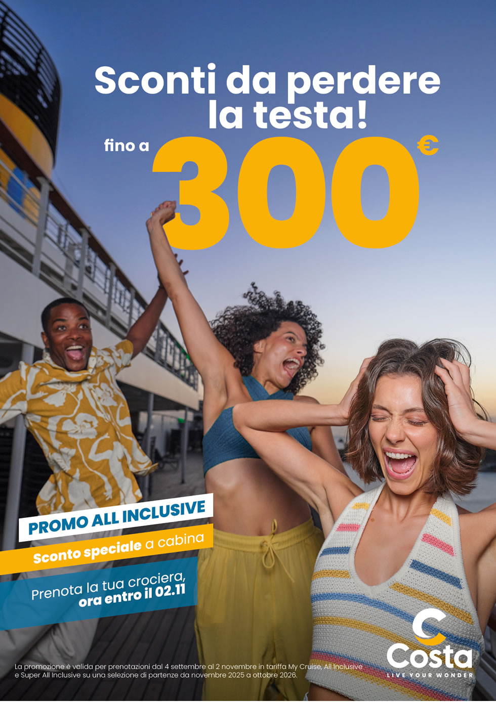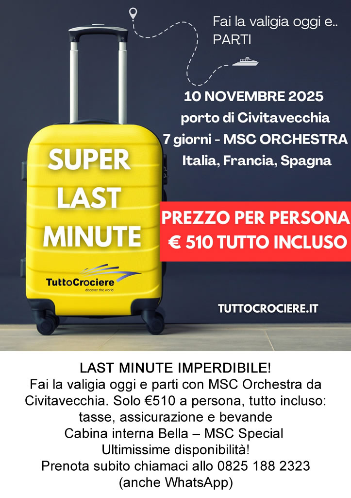 Prenota oggi stesso e approfitta di sconti esclusivi disponibili unicamente sul nostro sito. Non lasciarti sfuggire le nostre promozioni imperdibili. Solo su Tutto Crociere trovi le tariffe più vantaggiose per le tue vacanze da sogno.